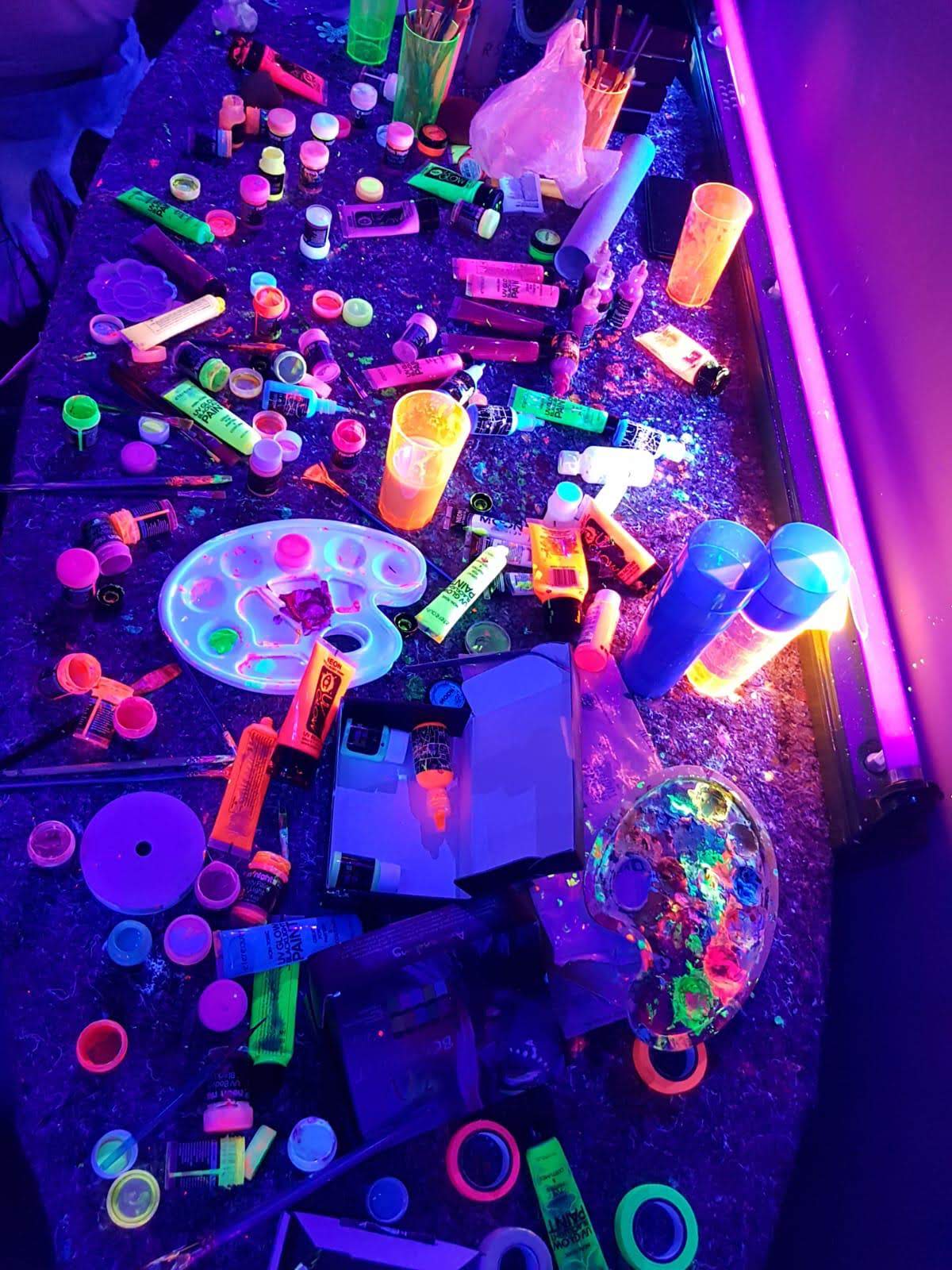 Wir werden euch UV-Licht-Bodypaintingfarbe, Pinsel und die Airbrushpaintingmaschine zur Verfügung stellen. Mit etwas Anleitung kann man sich dann von uns und Kolleginnen und Kollegen besprühen und bemalen lassen oder selbst den Pinsel in die Hand nehmen und loslegen.